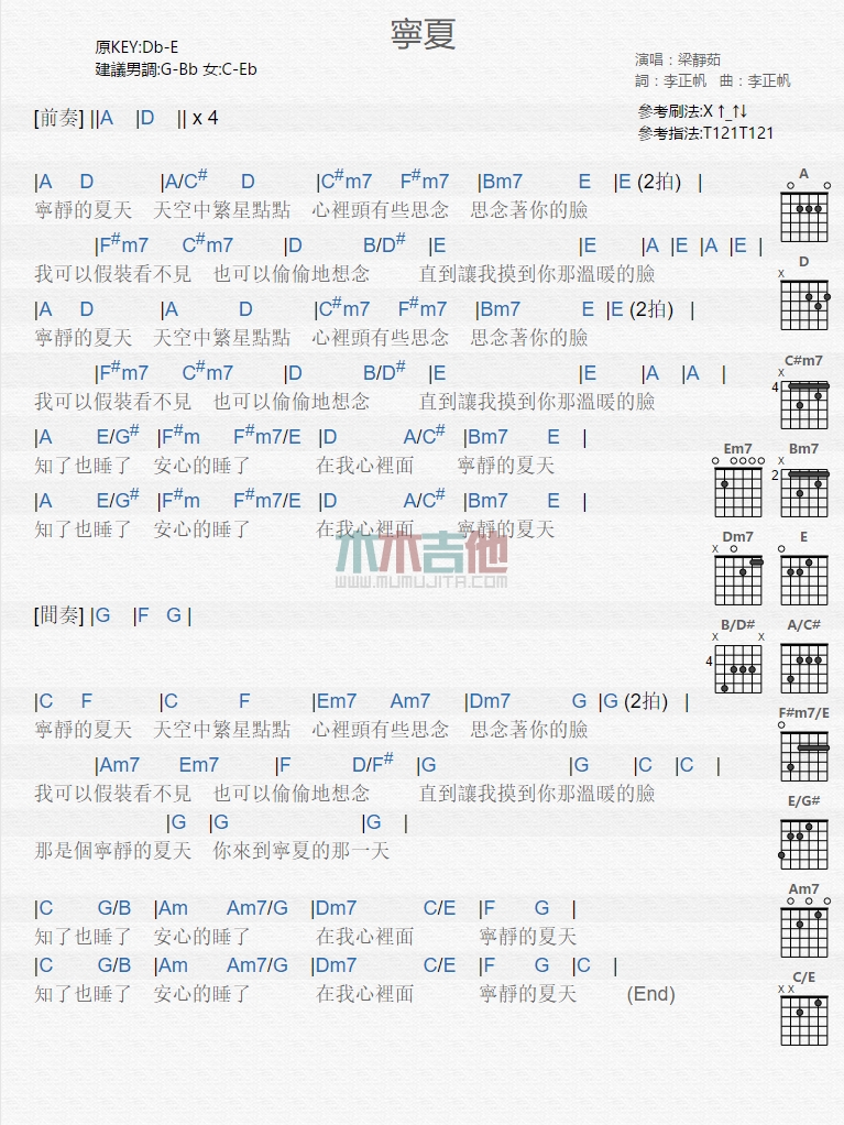 曲谱介绍: 梁静茹《宁夏》吉他弹唱谱,共有1张高清图谱,免翻页排版设计。