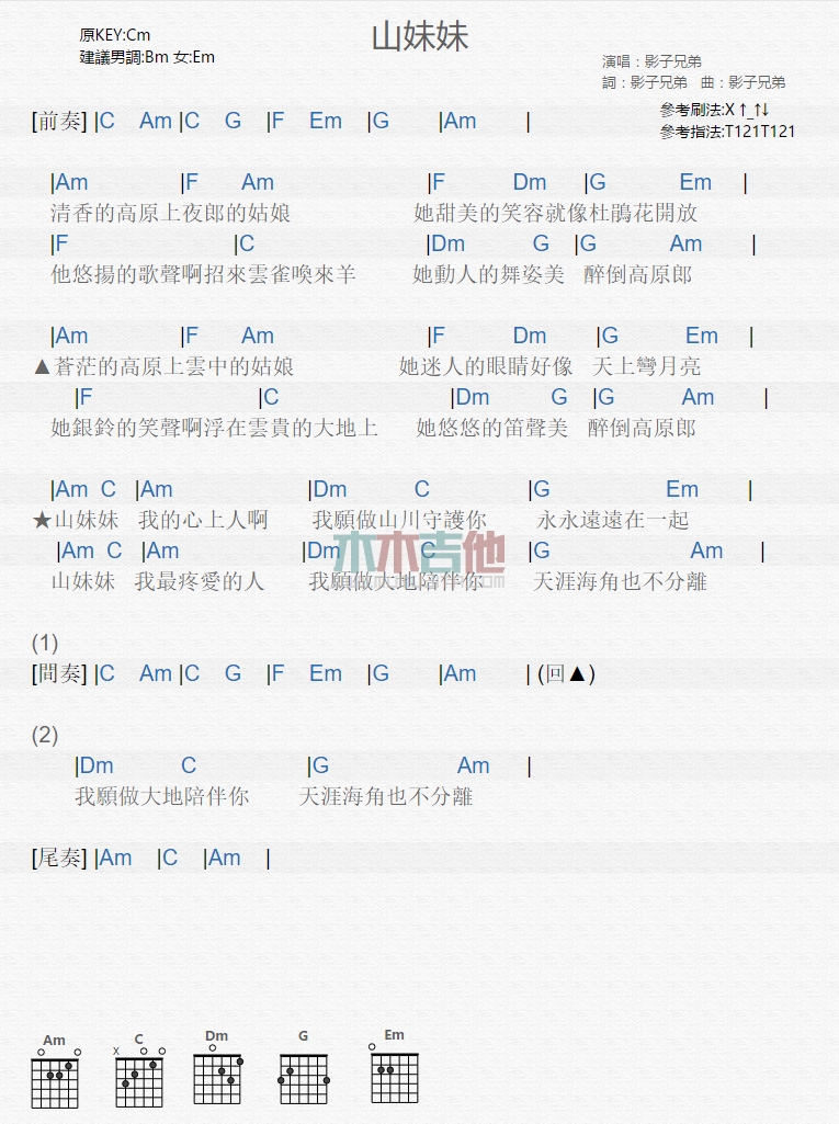 山妹妹吉他谱 - 影子兄弟 - 吉他弹唱谱