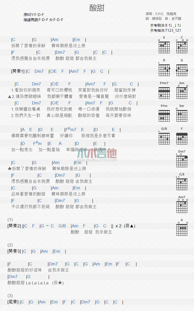 曲谱介绍: S.H.E《酸甜》吉他弹唱谱,共有1张高清图谱,免翻页排版设计。