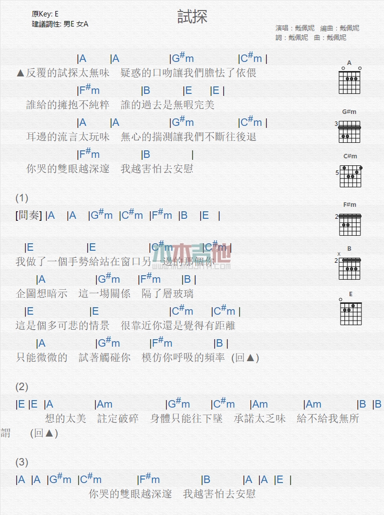 曲谱介绍: 戴佩妮《试探》吉他弹唱谱,共有1张高清图谱,免翻页排版设计。