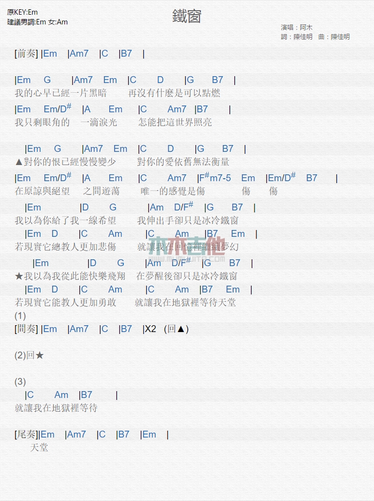 曲谱介绍: 阿木《铁窗》吉他弹唱谱,共有1张高清图谱,免翻页排版设计。