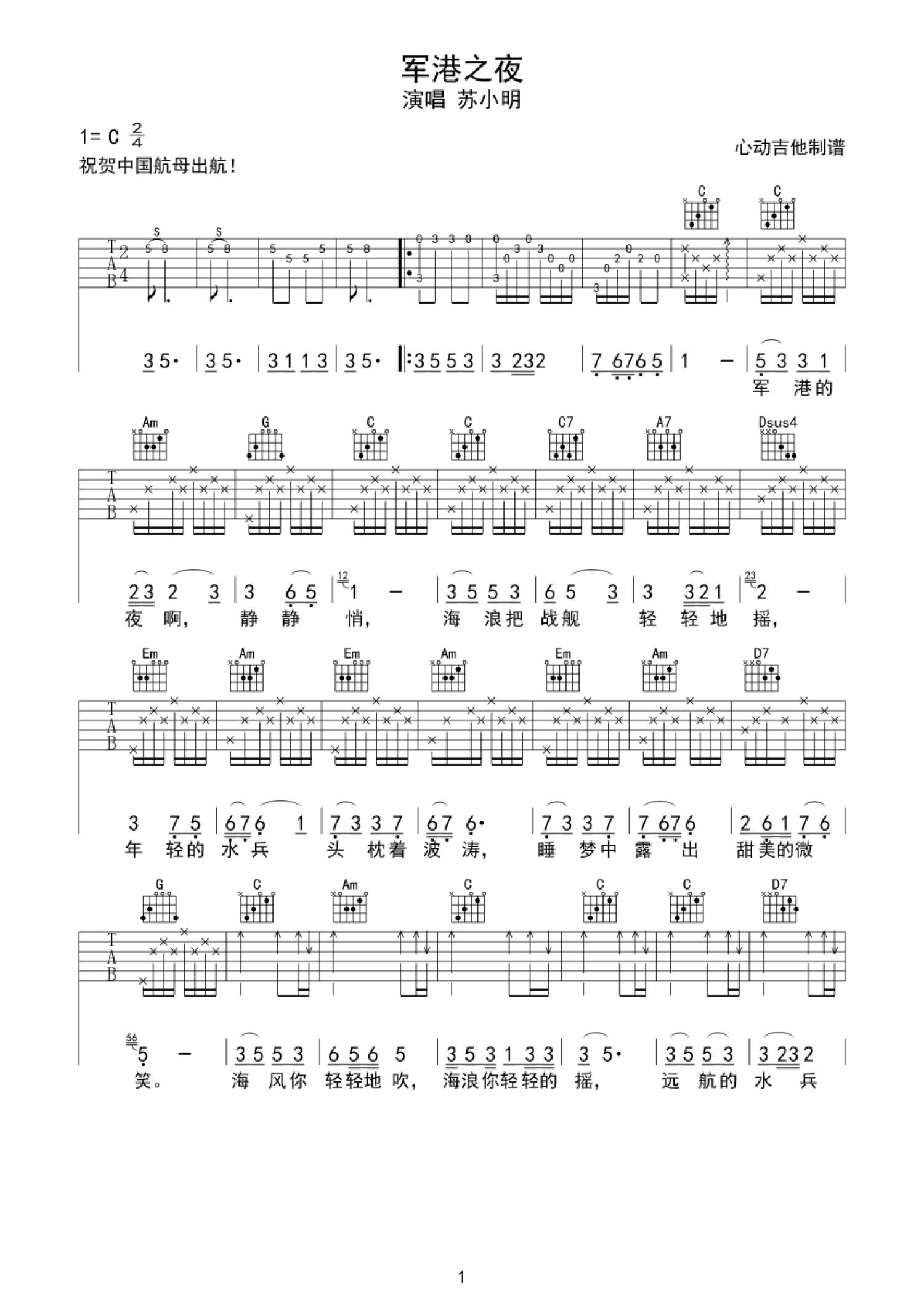 军港之夜吉他谱 - 苏小明 - C调吉他弹唱谱