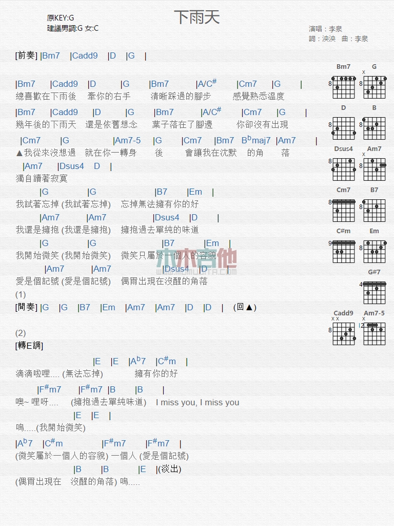 下雨天吉他谱 - 李泉 - 吉他弹唱谱