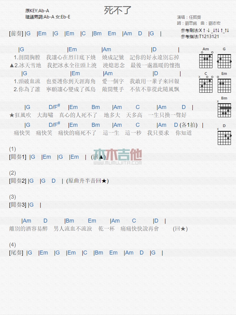 曲谱介绍: 任贤齐《死不了》吉他弹唱谱,共有1张高清图谱,免翻页排版设计。