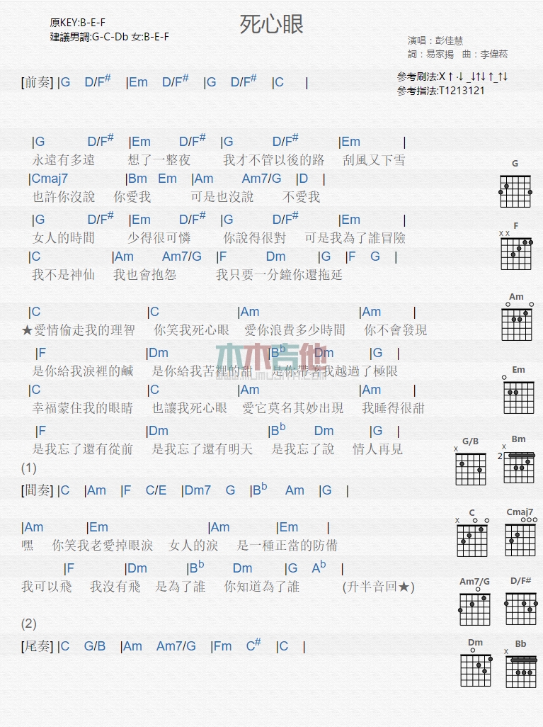 曲谱介绍: 彭佳慧《死心眼》吉他弹唱谱,共有1张高清图谱,免翻页排版设计。