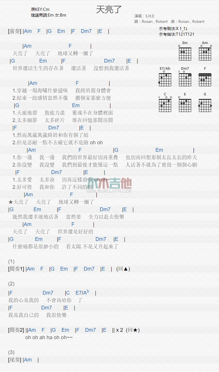 曲谱介绍: S.H.E《天亮了》吉他弹唱谱,共有1张高清图谱,免翻页排版设计。