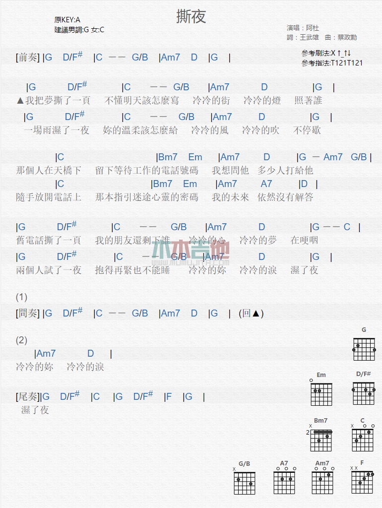 曲谱介绍: 阿杜《撕夜》吉他弹唱谱,共有1张高清图谱,免翻页排版设计。