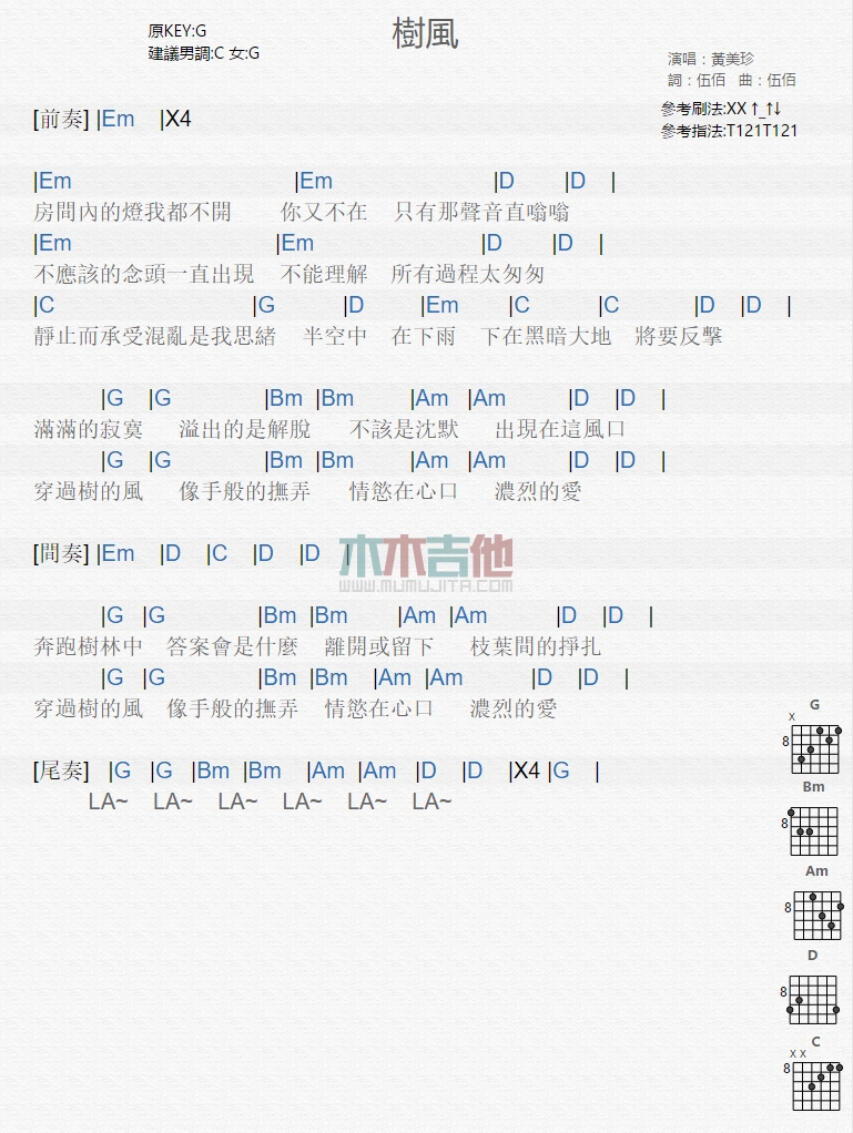 曲谱介绍: 黄美珍《树风》吉他弹唱谱,共有1张高清图谱,免翻页排版设计。