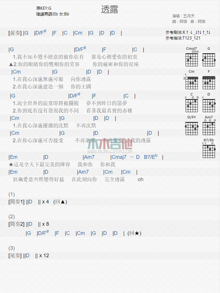 透露吉他谱 - 五月天 - 吉他弹唱谱