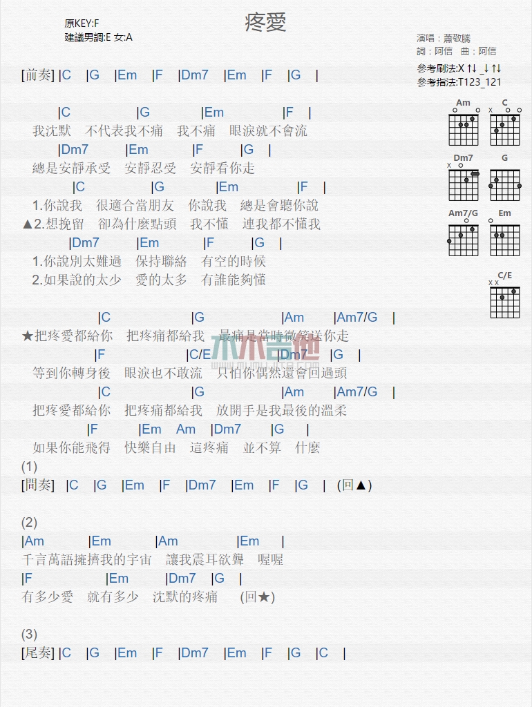 曲谱介绍: 萧敬腾《疼爱》吉他弹唱谱,共有1张高清图谱,免翻页排版设计。