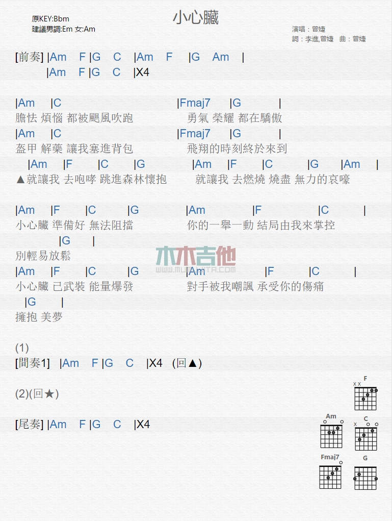小心脏吉他谱 - 曾婕 - 吉他弹唱谱