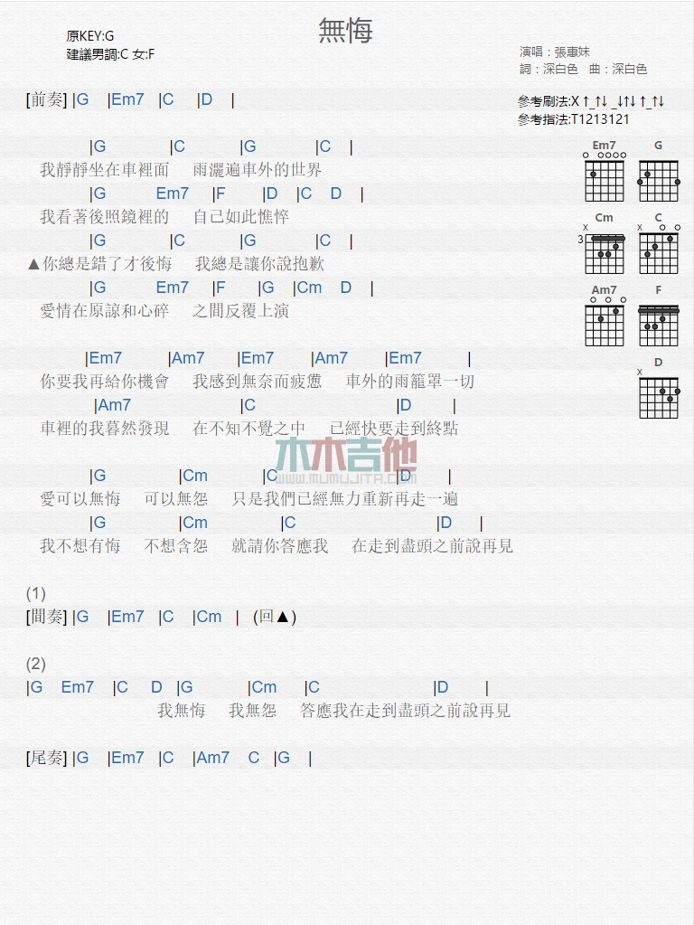 无悔吉他谱 - 张惠妹 - 吉他弹唱谱