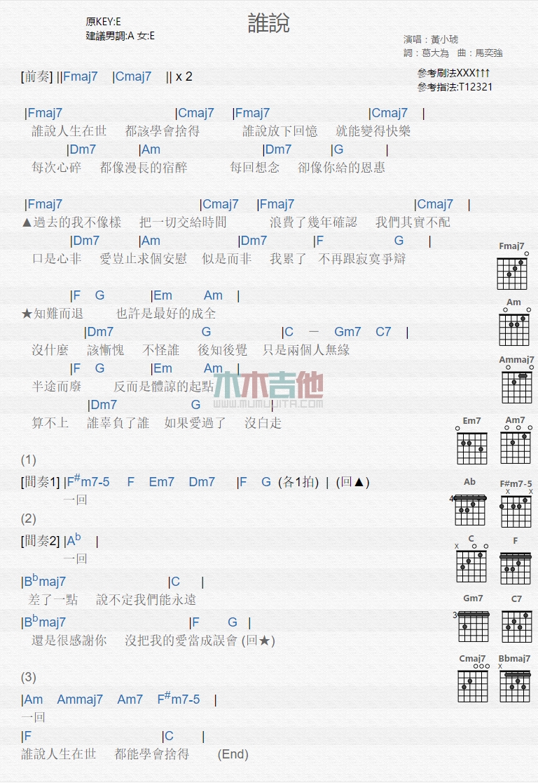 曲谱介绍: 黄小琥《谁说》吉他弹唱谱,共有1张高清图谱,免翻页排版设计。