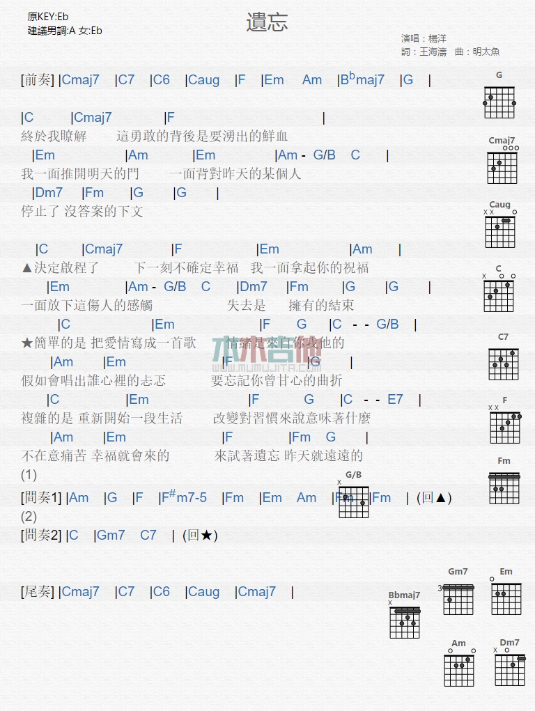 曲谱介绍: 杨洋《遗忘》吉他弹唱谱,共有1张高清图谱,免翻页排版设计。