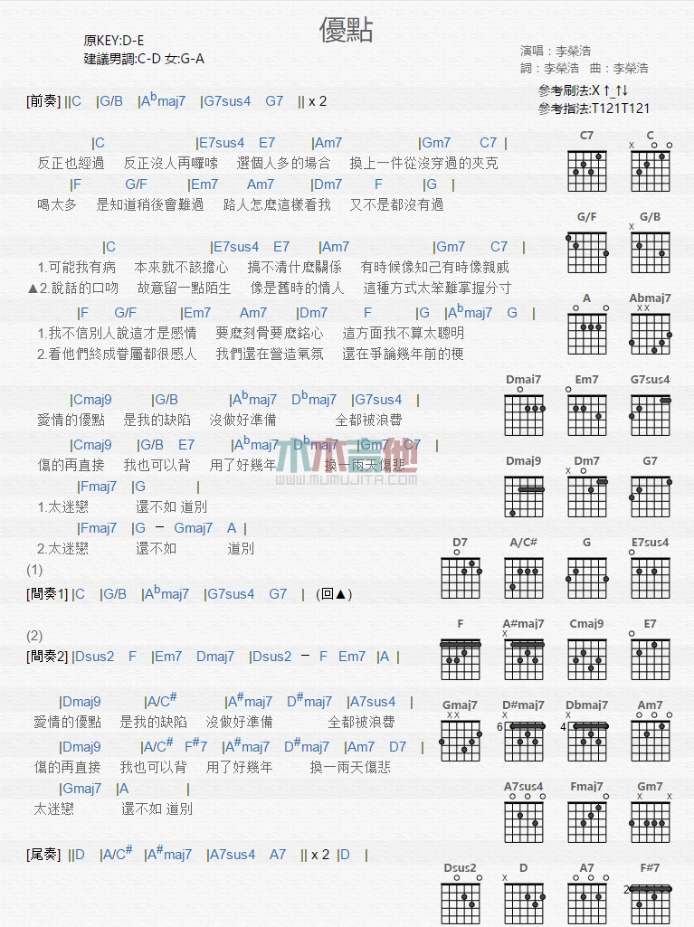 曲谱介绍: 李荣浩《优点》吉他弹唱谱,共有1张高清图谱,免翻页排版设计。
