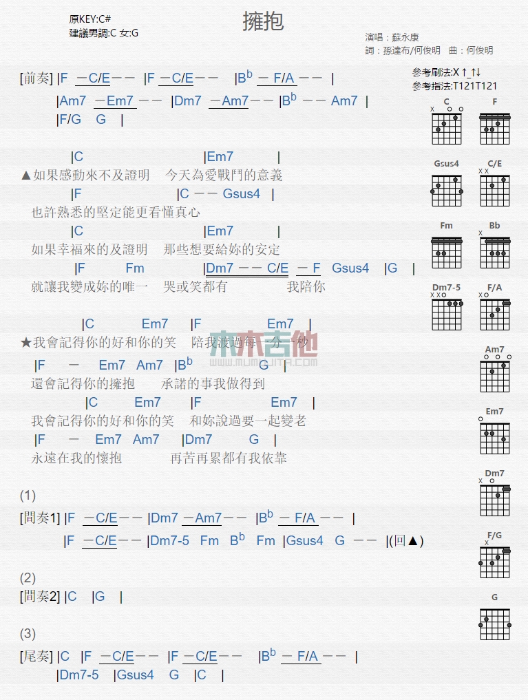 曲谱介绍: 苏永康《拥抱》吉他弹唱谱,共有1张高清图谱,免翻页排版设计。