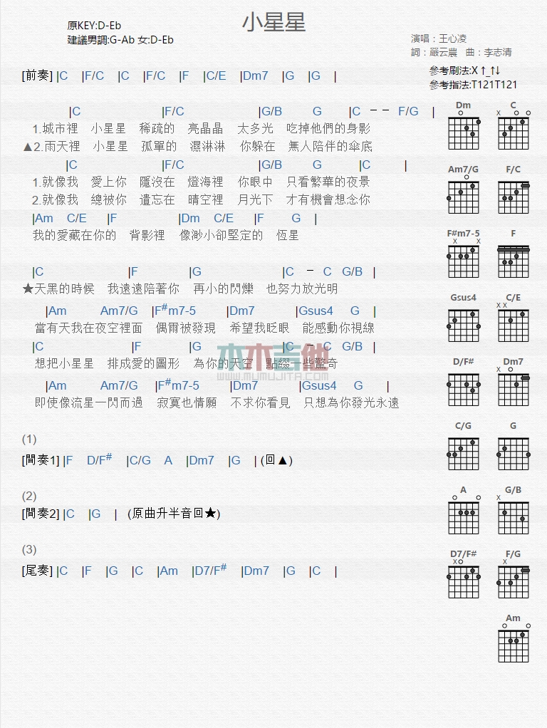 曲谱介绍: 王心凌《小星星》吉他弹唱谱,共有1张高清图谱,免翻页排版设计。