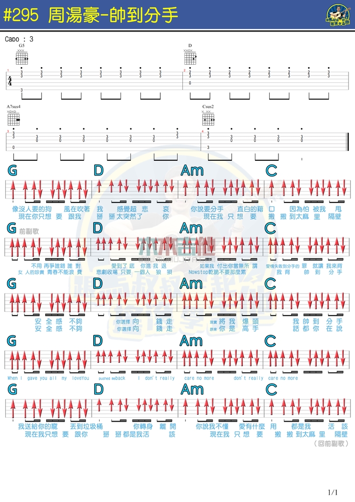 曲谱介绍: 周汤豪《帅到分手》吉他弹唱谱,共有1张高清图谱,免翻页排版设计。
