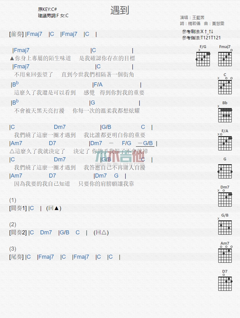 曲谱介绍: 王蓝茵《遇到》吉他弹唱谱,共有1张高清图谱,免翻页排版设计。