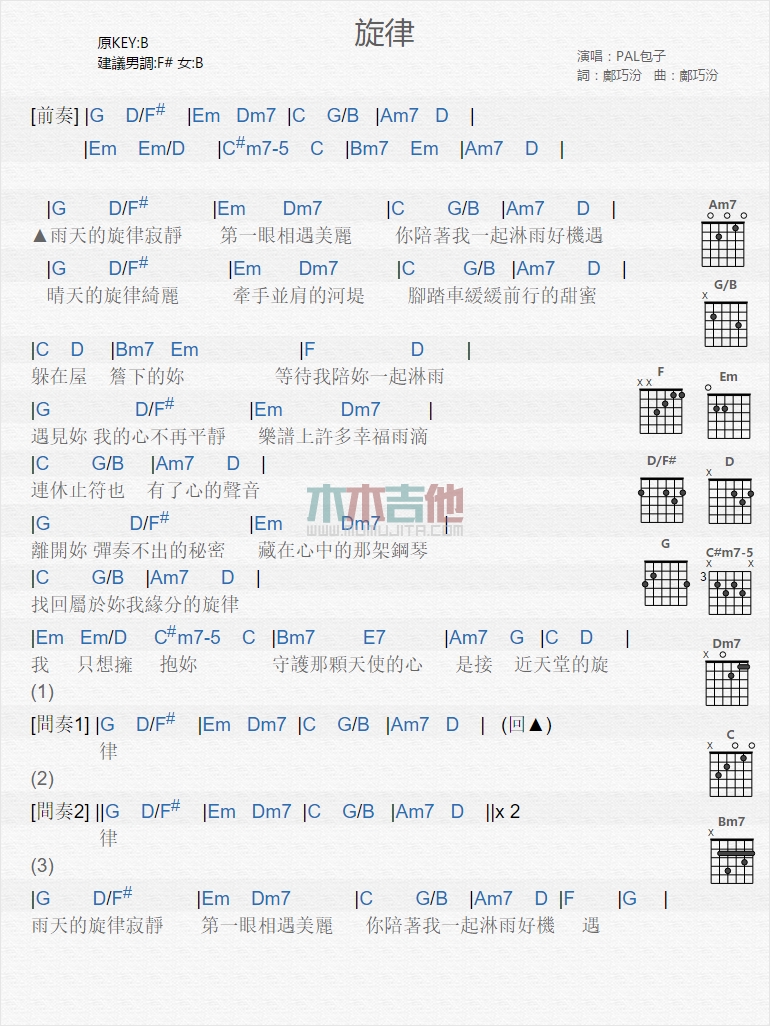 曲谱介绍: PAL包子《旋律》吉他弹唱谱,共有1张高清图谱,免翻页排版设计。