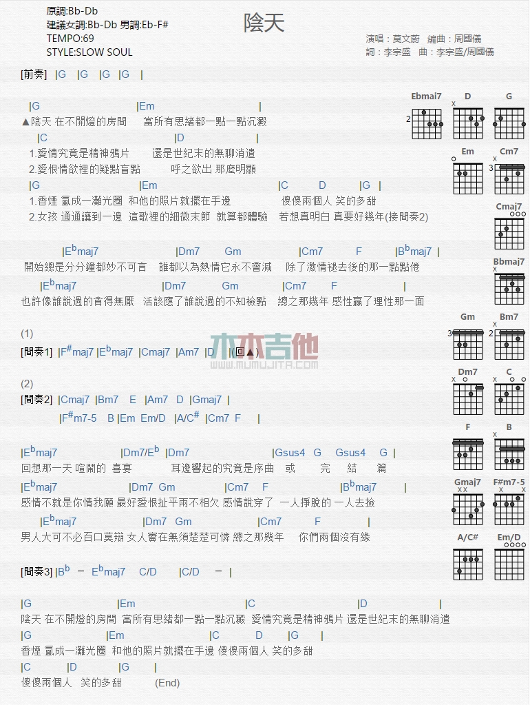 曲谱介绍: 莫文蔚《阴天》吉他弹唱谱,共有1张高清图谱,免翻页排版设计。