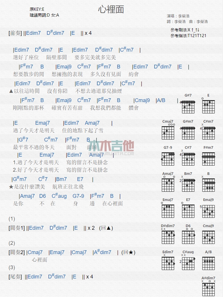 心里面吉他谱 - 李荣浩 - 吉他弹唱谱