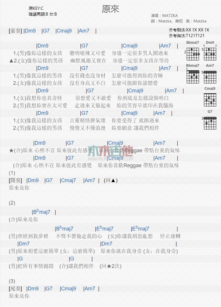 曲谱介绍: MATZKA,家家《原来》吉他弹唱谱,共有1张高清图谱,免翻页排版设计。