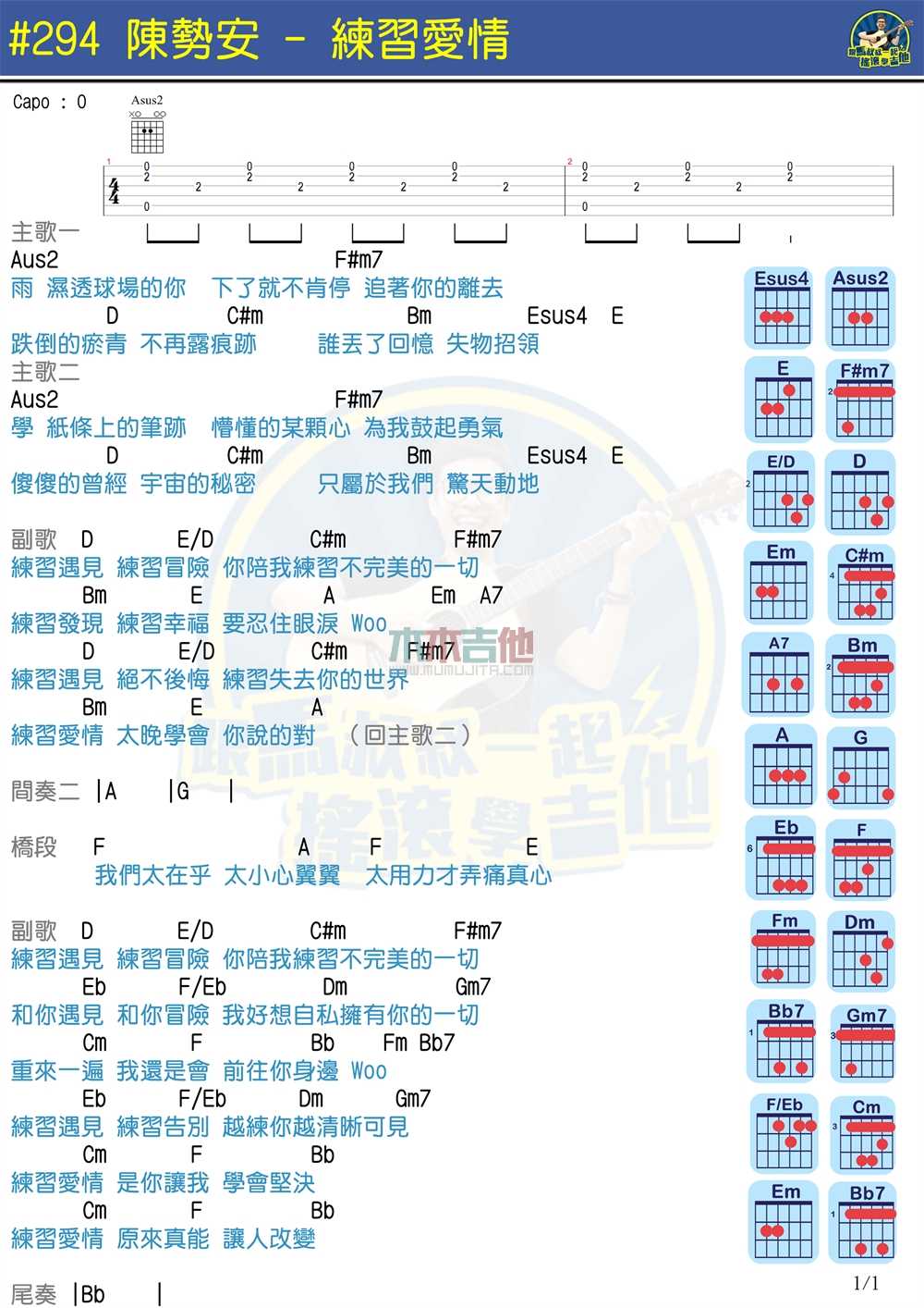 曲谱介绍: 陈势安《练习爱情》吉他弹唱谱,共有1张高清图谱,免翻页排版设计。