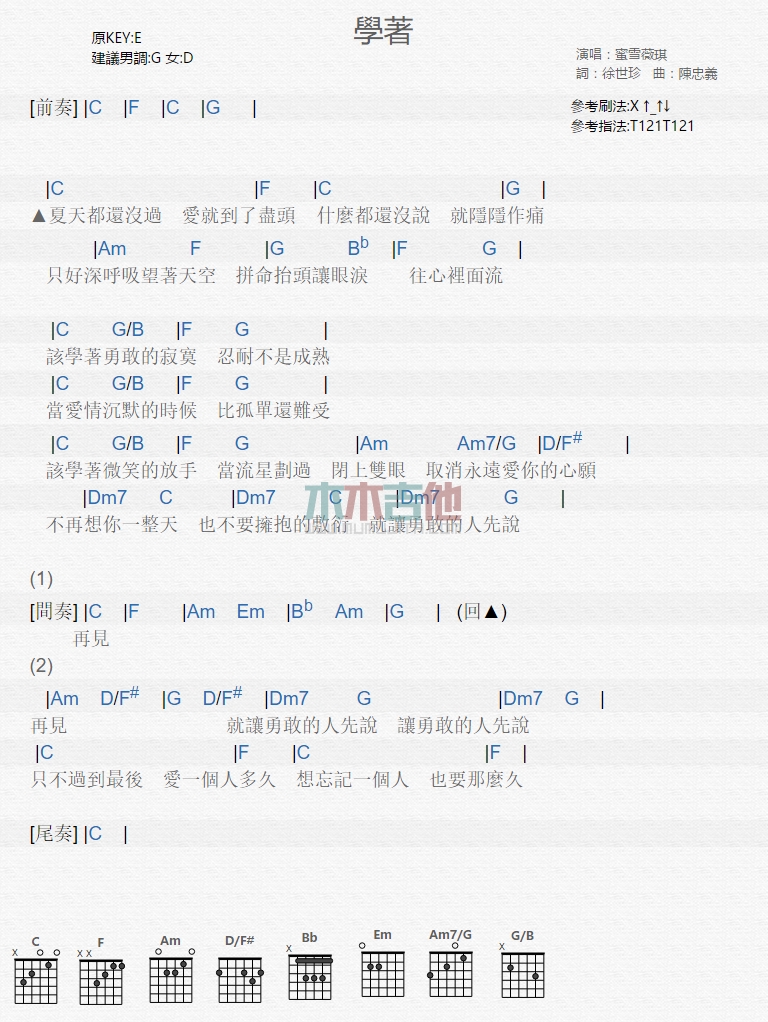 曲谱介绍: 蜜雪薇琪《学着》吉他弹唱谱,共有1张高清图谱,免翻页排版设计。