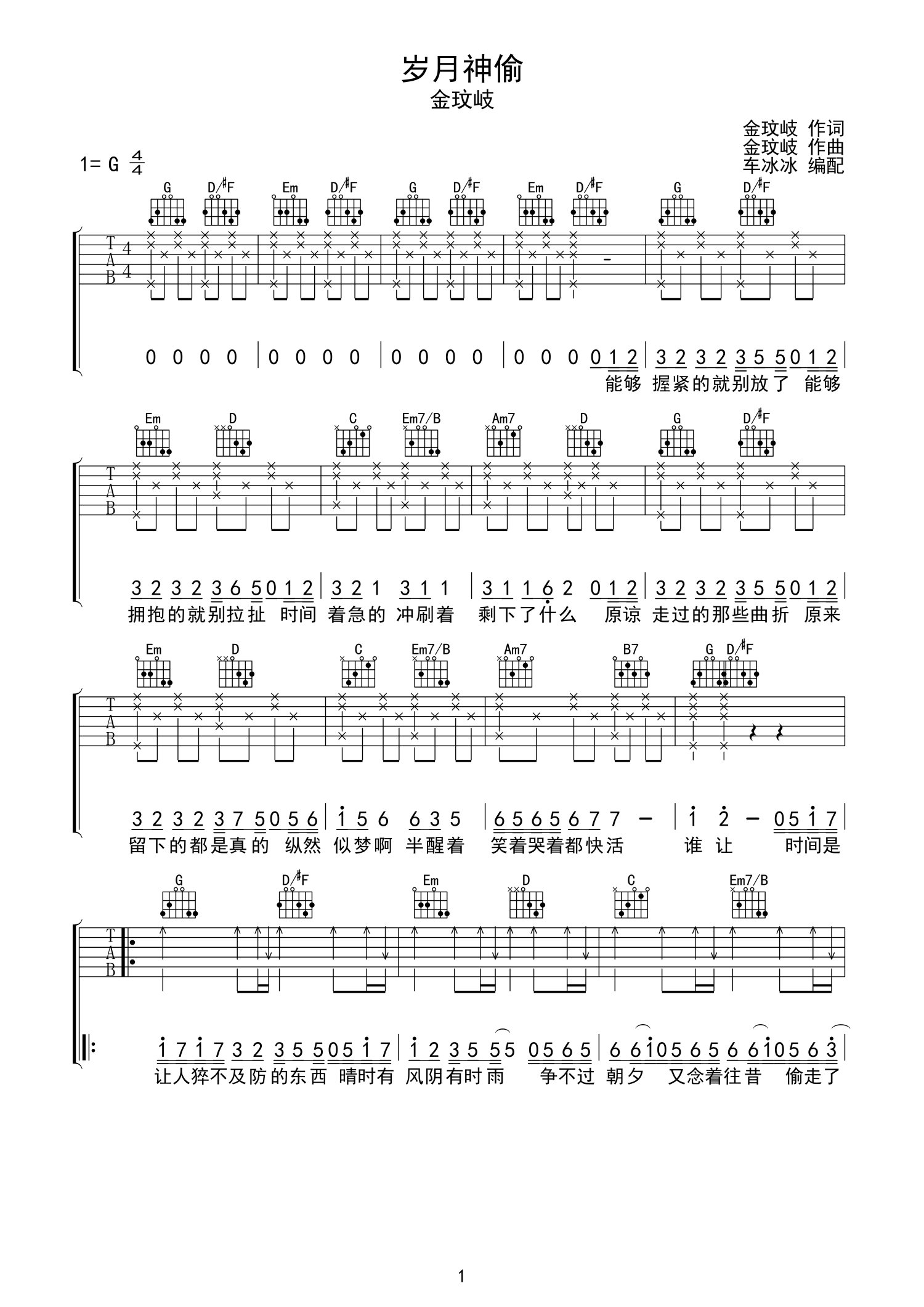 曲谱介绍: 金玟岐《岁月神偷》吉他谱_G调吉他弹唱谱_无限延音