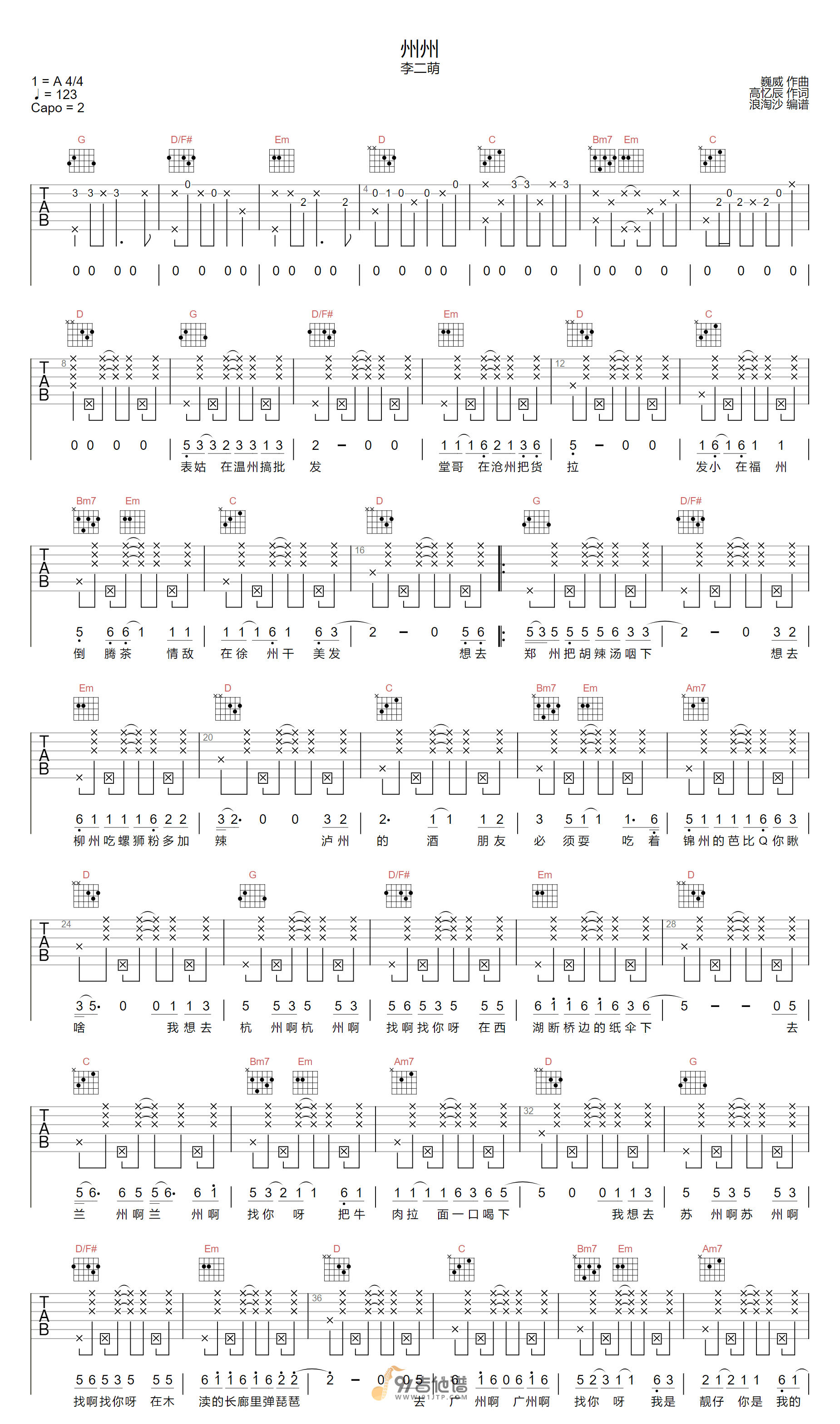曲谱介绍: 曲谱简介:州州吉他谱,李二萌演唱的一首歌曲,4/4拍的节奏,这首歌曲的原调为A调,这里曲谱采用了G调指法进行编配,演唱时夹变调夹2品可回到原调,也可根据个人实际嗓音情况选择。曲谱由浪淘沙编配出品。“表姑在温州搞批发,堂哥在沧州把货拉,发小在福州倒腾茶,情敌在徐州干美发”,很有意思的歌词,很有意思的歌曲。