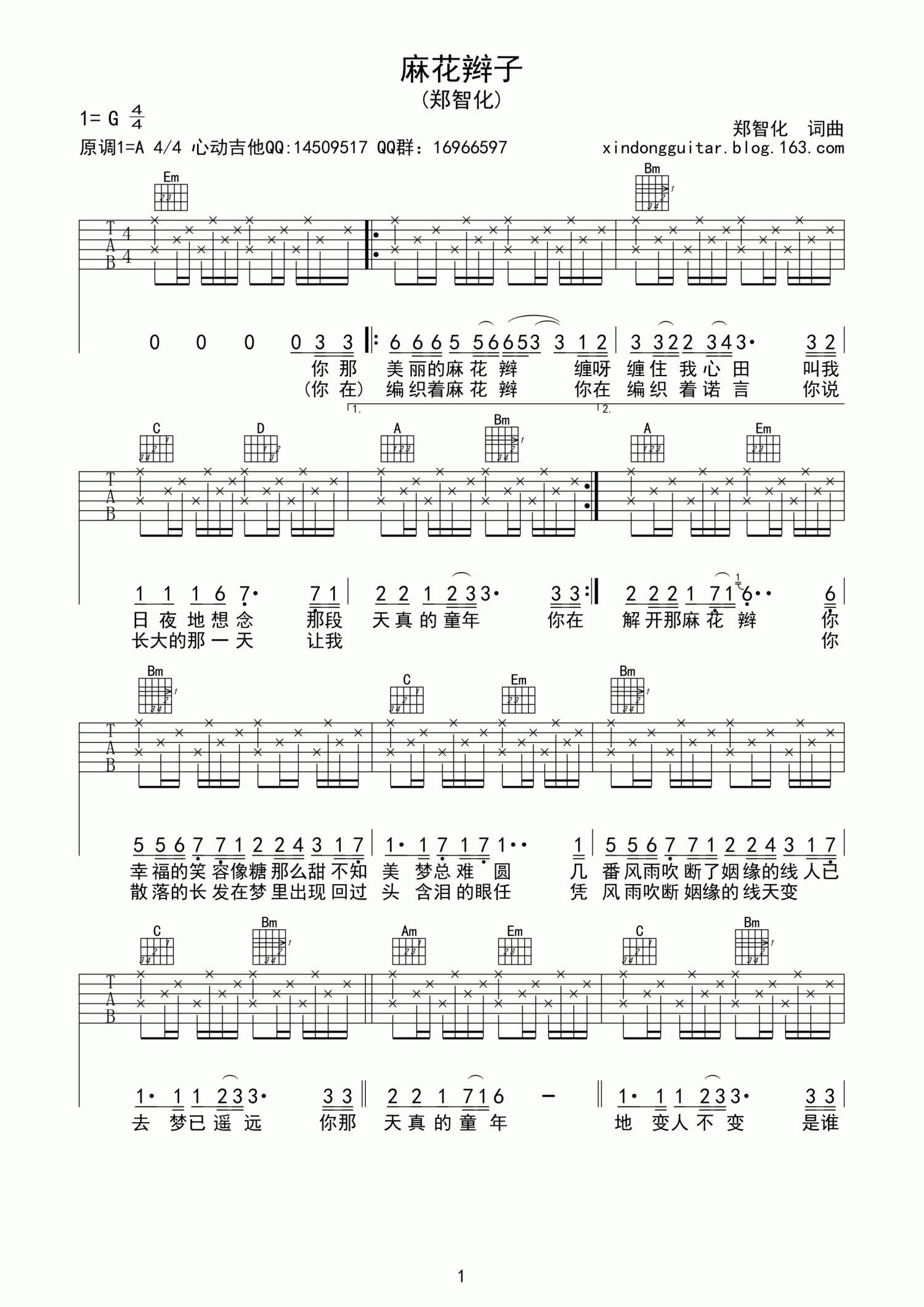 麻花辫子吉他谱 - 郑智化 - G调吉他弹唱谱