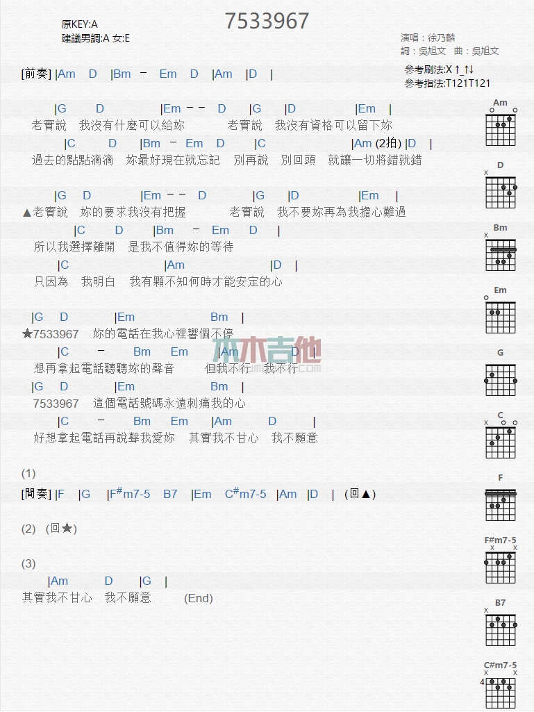 曲谱介绍: 徐乃麟《7533967》吉他弹唱谱,共有1张高清图谱,免翻页排版设计。