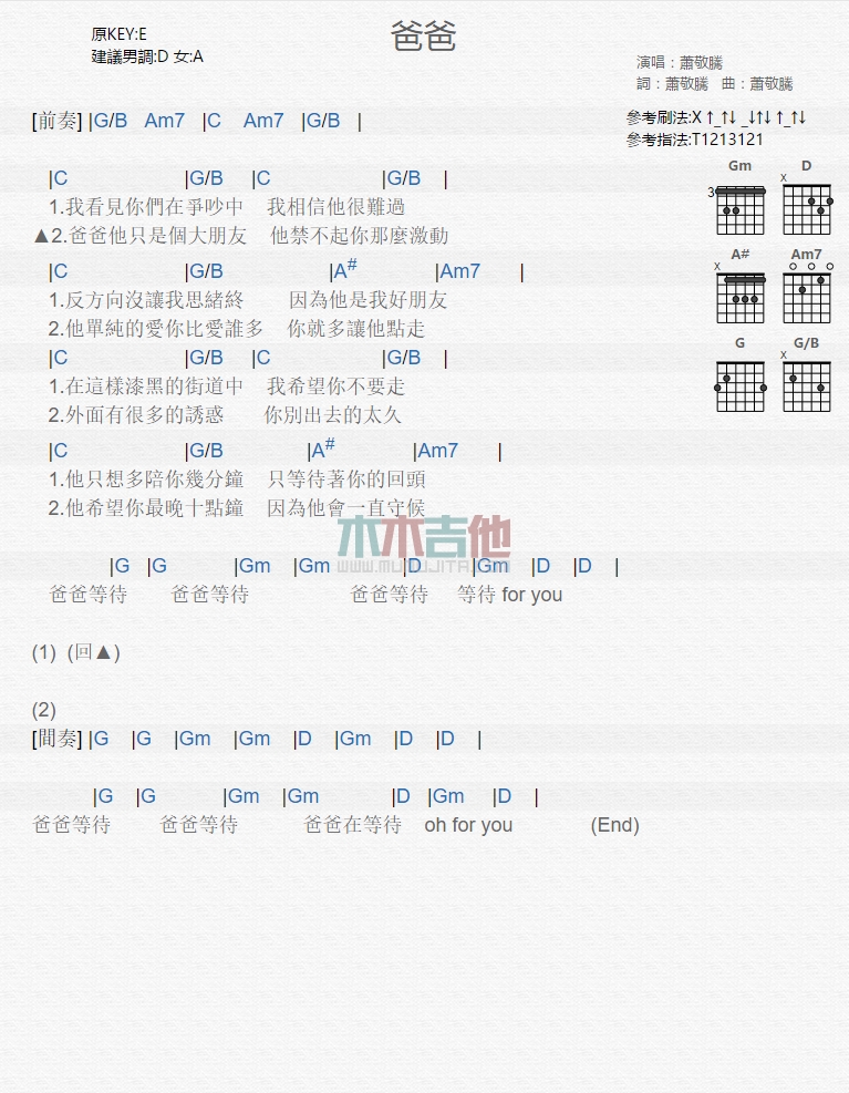 曲谱介绍: 萧敬腾《爸爸》吉他弹唱谱,共有1张高清图谱,免翻页排版设计。