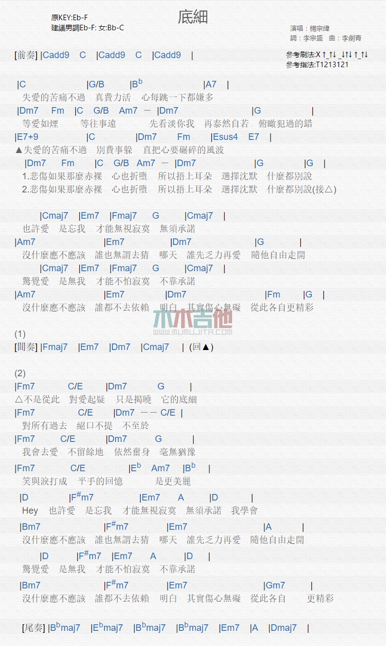 曲谱介绍: 杨宗纬《底细》吉他弹唱谱,共有1张高清图谱,免翻页排版设计。