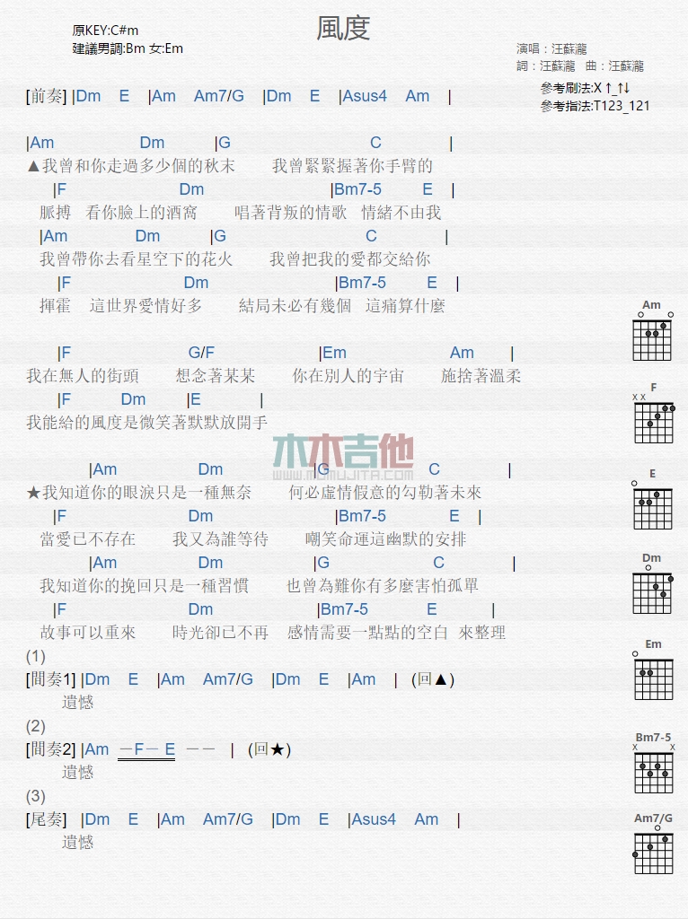 风度吉他谱 - 汪苏泷 - 吉他弹唱谱