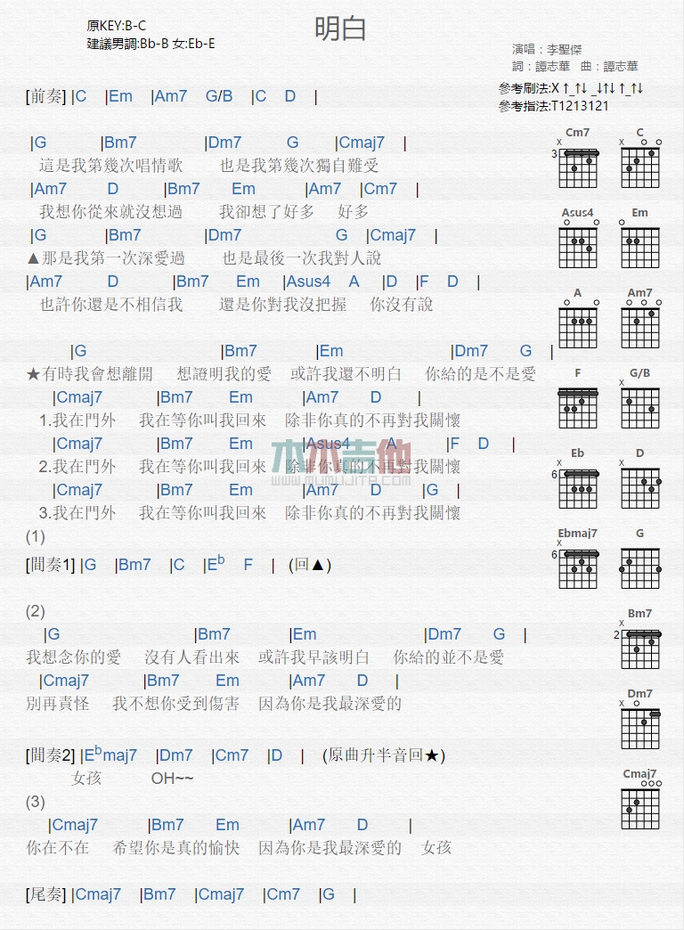 明白吉他谱 - 李圣杰 - 吉他弹唱谱