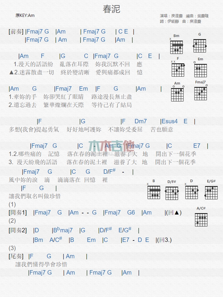 曲谱介绍: 庾澄庆《春泥》吉他弹唱谱,共有1张高清图谱,免翻页排版设计。