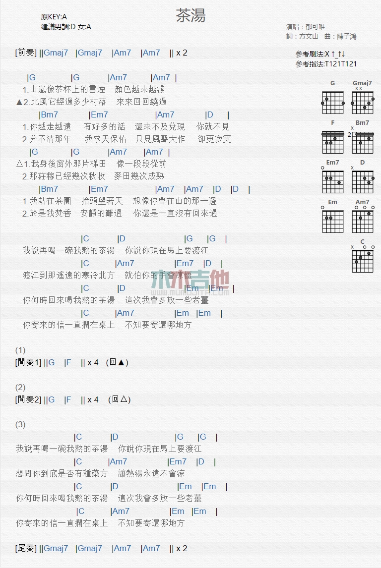 曲谱介绍: 郁可唯《茶汤》吉他弹唱谱,共有1张高清图谱,免翻页排版设计。