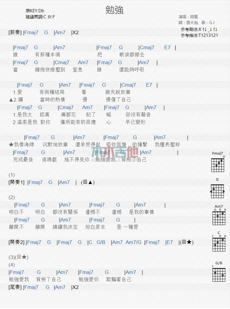 曲谱介绍: 胡夏《勉强》吉他弹唱谱,共有1张高清图谱,免翻页排版设计。