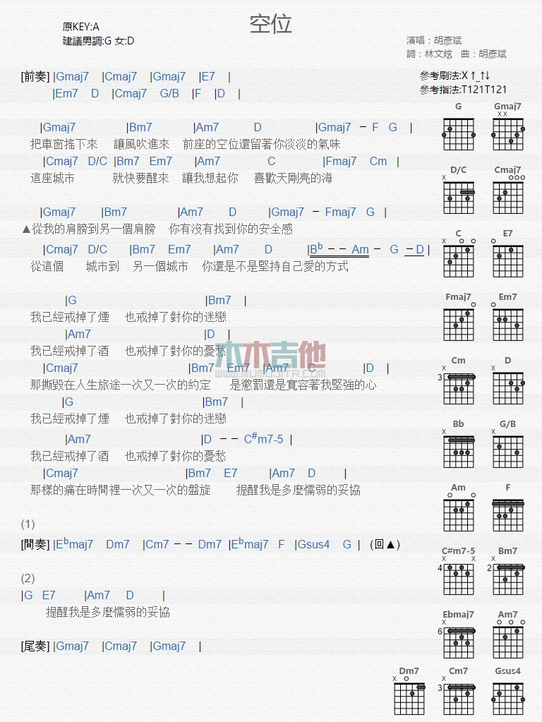曲谱介绍: 胡彦斌《空位》吉他弹唱谱,共有1张高清图谱,免翻页排版设计。