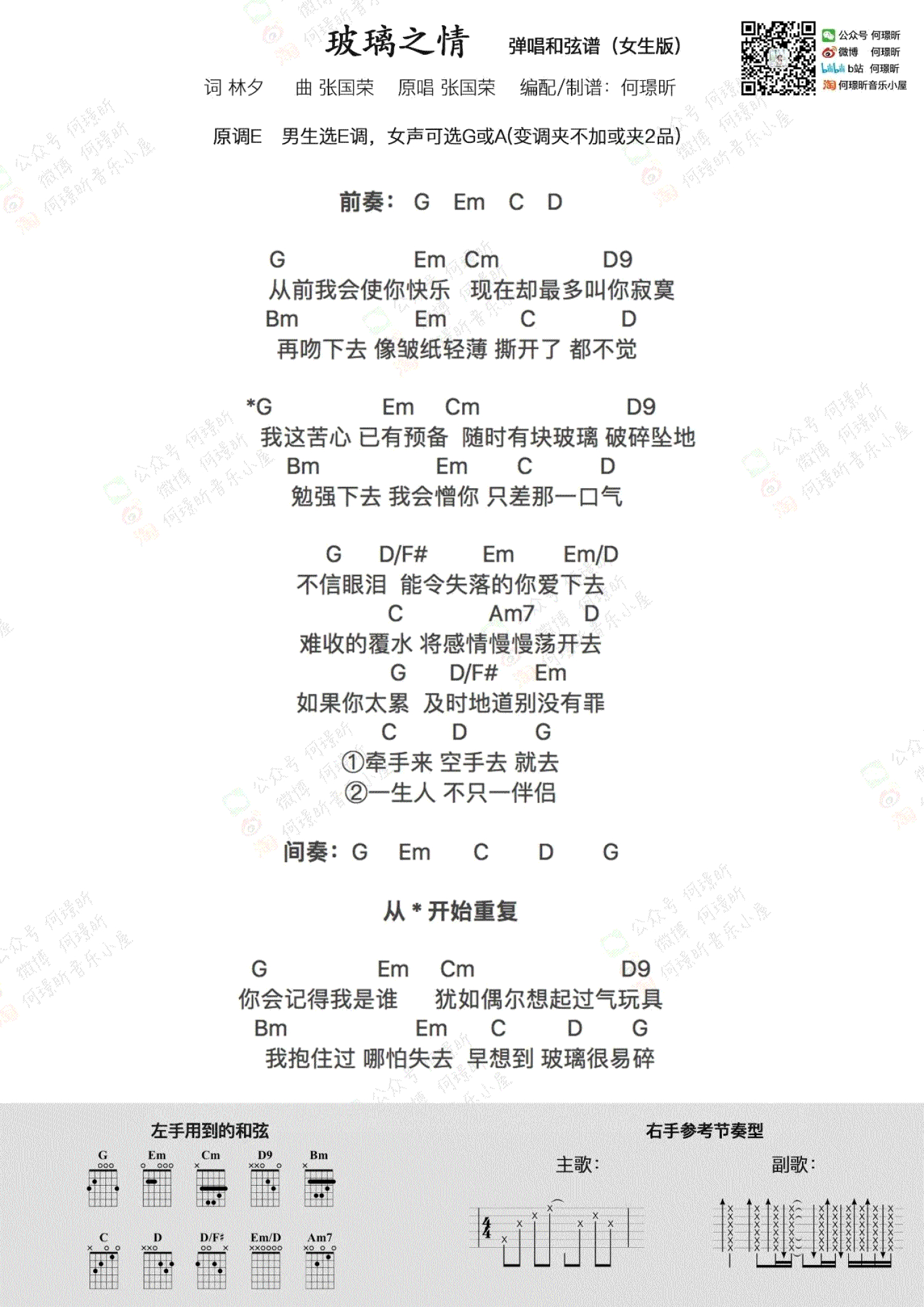 曲谱介绍: 《玻璃之情》吉他谱,张国荣的一首经典粤语歌曲,不信眼泪,能令失落的你爱下去,难收的覆水,将感情漫漫荡开去。玻璃之情吉他弹唱和弦谱,何Z昕编配分享,随谱附上弹唱演示视频打谱啦网整理上传。编配说明:老师做了两个版本的谱子~男生版和女生版。原版是E调,但考虑到可能大部分朋友不熟悉E调的和弦(也比较多横按)所以就给男生们准备了C调的指法,男生们可以变调夹从2-4品试过去,找到自己合适的音高,原调的话就是夹4品~女生版是G调指法,但G调对于我来说有点低,所以我夹了2品变调夹唱的是A调的音高~