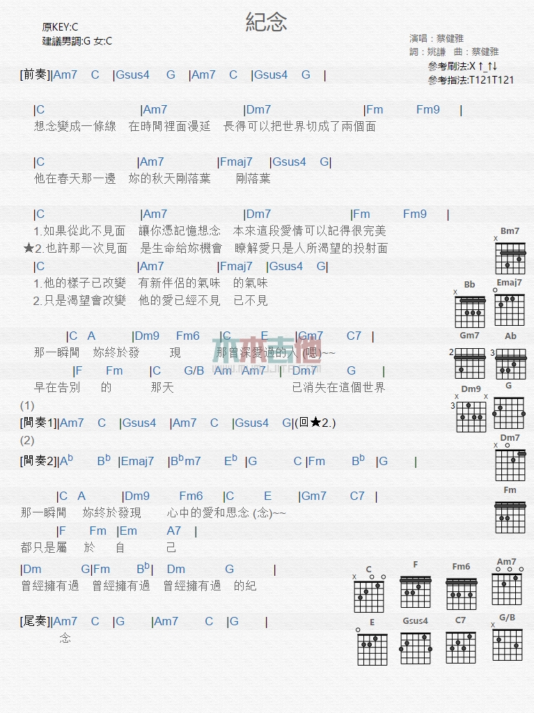 曲谱介绍: 蔡健雅《纪念》吉他弹唱谱,共有1张高清图谱,免翻页排版设计。