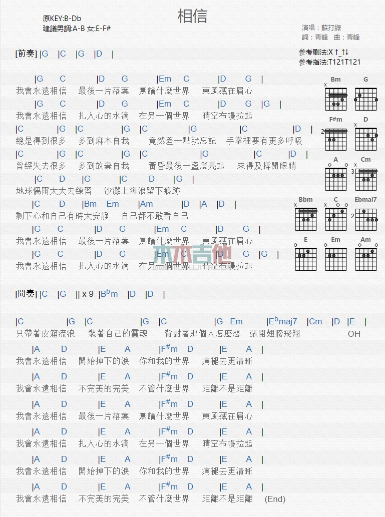 曲谱介绍: 苏打绿《相信》吉他弹唱谱,共有1张高清图谱,免翻页排版设计。