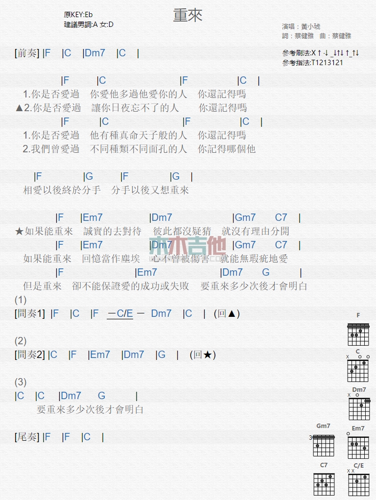 曲谱介绍: 黄小琥《重来》吉他弹唱谱,共有1张高清图谱,免翻页排版设计。