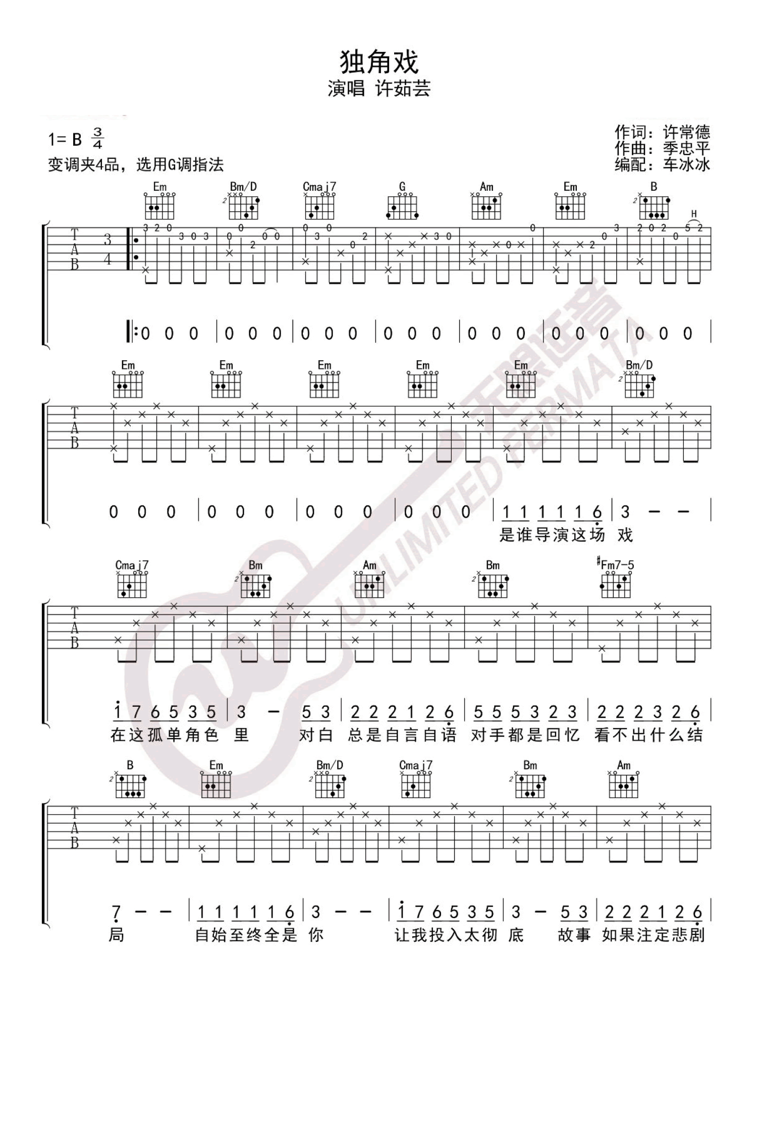 曲谱介绍: 许茹芸《独角戏》吉他谱_C调吉他弹唱谱