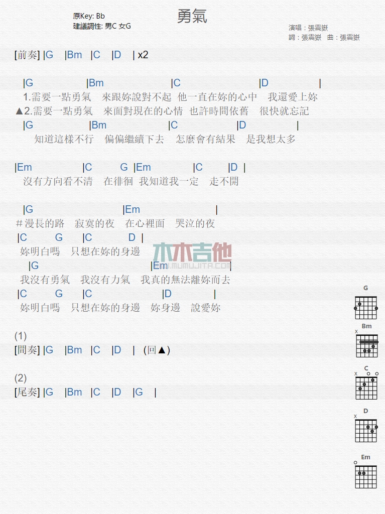 曲谱介绍: 张震岳《勇气》吉他弹唱谱,共有1张高清图谱,免翻页排版设计。