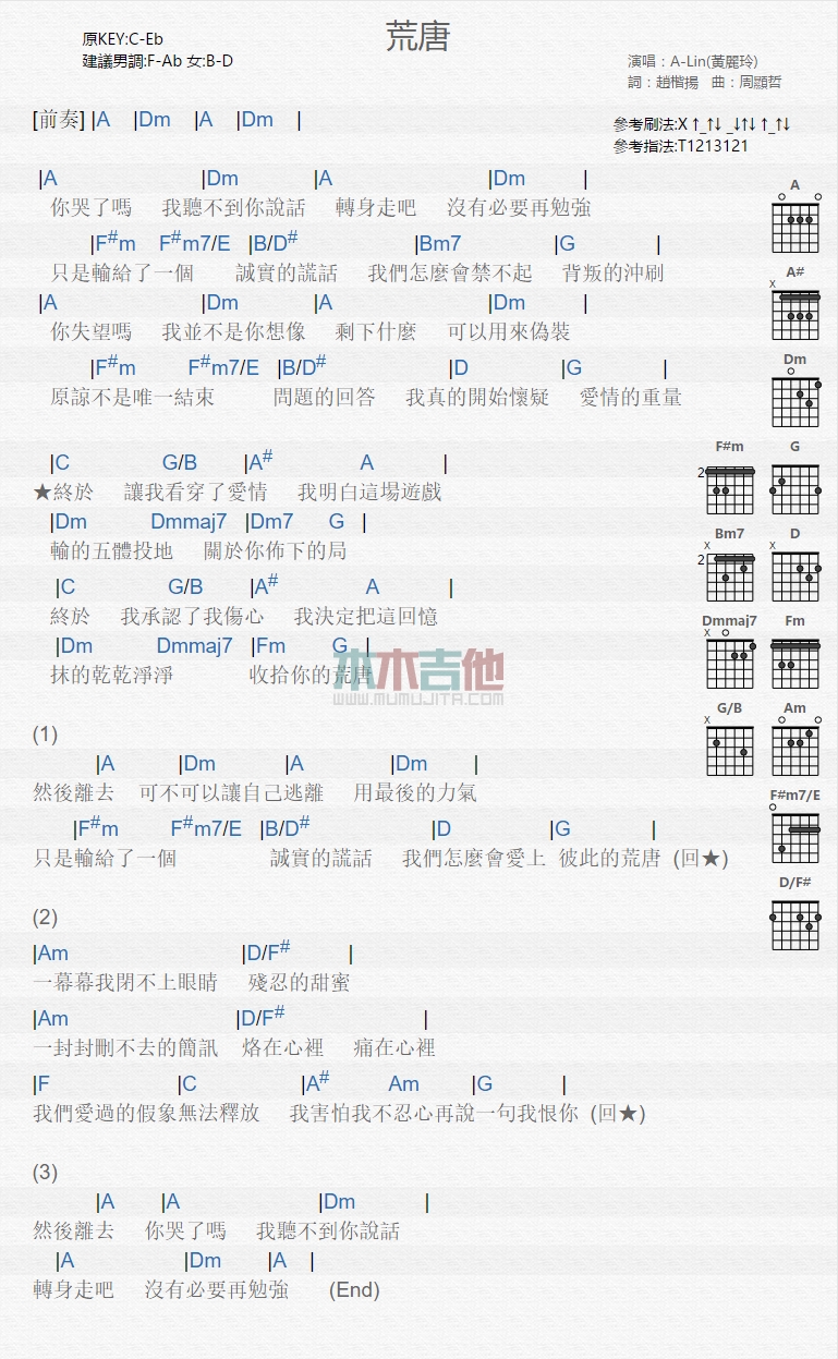 曲谱介绍: 黄丽玲《荒唐》吉他弹唱谱,共有1张高清图谱,免翻页排版设计。