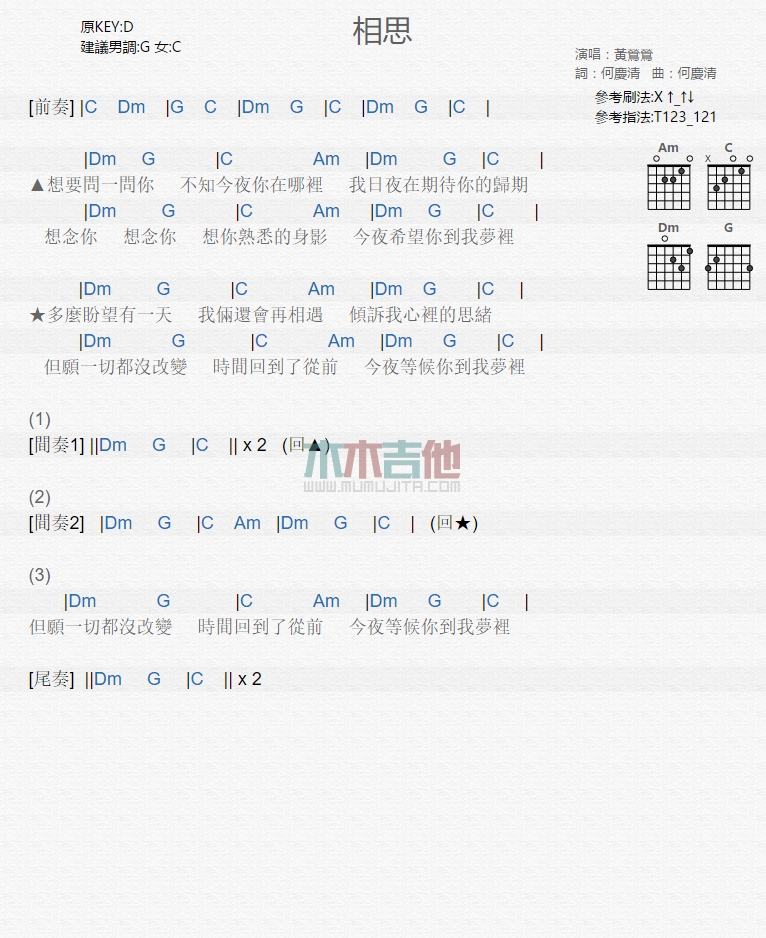 曲谱介绍: 黄莺莺《相思》吉他弹唱谱,共有1张高清图谱,免翻页排版设计。