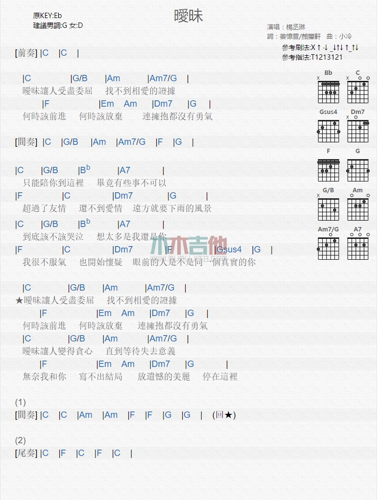 曲谱介绍: 杨丞琳《暧昧》吉他弹唱谱,共有1张高清图谱,免翻页排版设计。